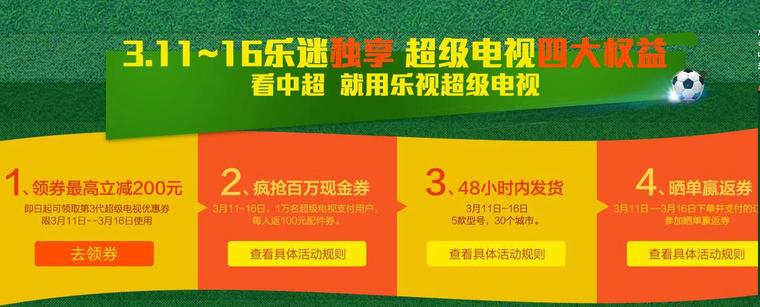 3月11日-16日,在乐视商城参与活动购买超级电视,领券立减,最高200元!下单就送百万现金券!晒单还能赢返券!