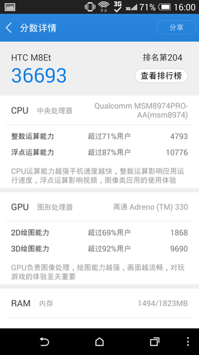 接下来是鲁大师跑分,结果是36693分,结果是超过了85%的对手,由于HTC M8 Eye采用的是高通骁龙801处理器,因此拿到这样的成绩并不让人意外。