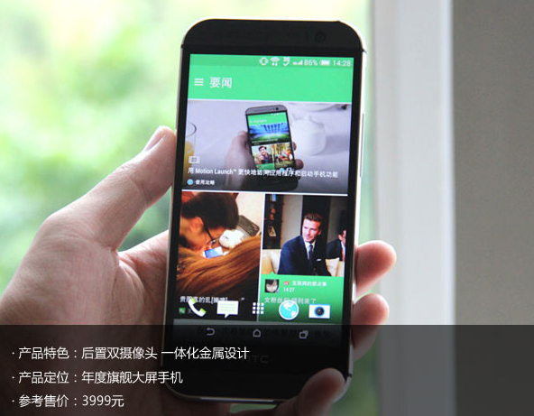 HTC M8 Eye搭载的是基于Android 4.4自主研发Sense 6.0 UI系统,该UI在很多交互上与传统的Android不太一样。系统也在解锁方式上进行了一定的优化,其中一点要进行介绍的是主界面向右滑动,出现的BlinkFeed新闻聚合,能够帮助人们更快的了解最新的新闻资讯,当然这个也能够聚合一定新闻源,此外还能加入微博微信这样的社交软件在其中,使得功能更加简洁方便了。