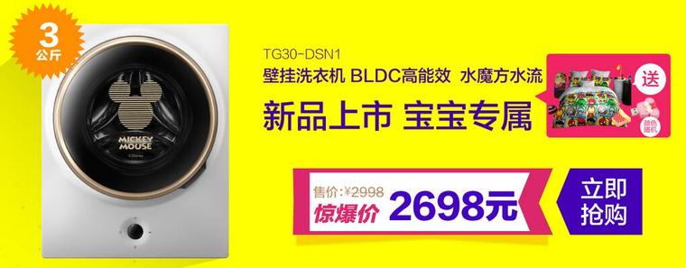 3、新品上市。宝宝专用3KG洗衣机TG30-DSN1全新上市,新品惊爆价只需2698元,另外再送床品四件套+U盘(赠品单独配送,约在确认收货后30天内送达)。