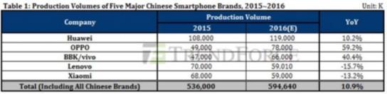 要知道,根据第三方机构TrendForce预测,2016年OPPO的手机生产量约为7800万部,vivo约为6600万部,将仅次于华为的1亿1900万部,分列中国手机品牌的二三位。而且两者也都将成为中国成长最快的手机品牌,年成长率均有望突破40%。