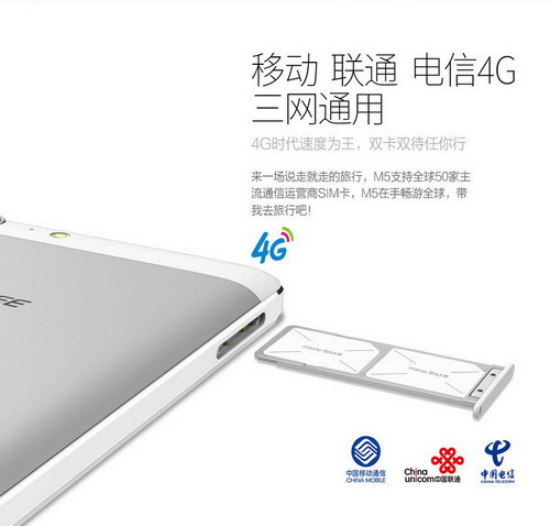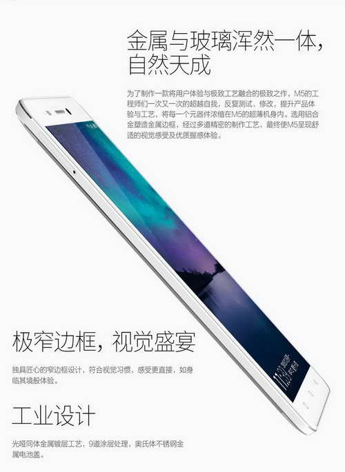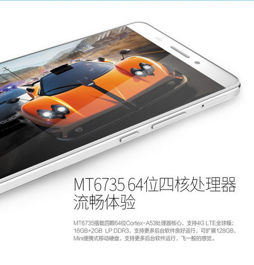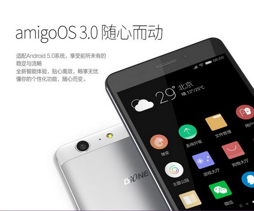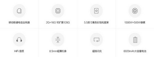 其他配置方面,金立M5手机搭载5.5英寸三星超炫魔丽屏,分辨率为HD级(1280 X 720);内置联发科MT6735四核64位处理器,主频为1.3GHz;内存组合为2GB RAM + 16 GB ROM,最高支持128GB TF卡扩展;前置500万像素+后置1300万像素摄像头。支持双卡七模全网通,运行Amigo 3.0系统(基于Android 5.1)。