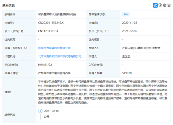 据企查查数据显示,格力电器今日公开了一项关于折叠屏设备的设计专利,名称为“可折叠屏幕以及折叠屏移动终端”,申请日期为2020年11月26日,专利公开号为CN112333310A,申请人为珠海格力电器股份有限公司。