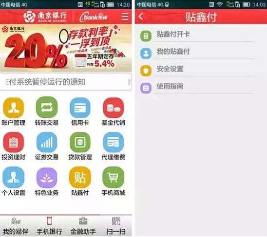 南京银行“贴鑫付”是南京银行根据银行卡组织的HCE云端支付规范,基于具备NFC功能的手机发放的具有独立卡号、独立密码和账户的移动金融IC卡产品。 通过南京银行手机银行在手机中建立一张手机虚拟IC卡与用户的南京银行实体借记卡进行绑定。绑定成功后,用户只需携带具有NFC功能的手机在具有银联闪付 标识的POS机上进行刷机消费,输入密码后即可完成支付。