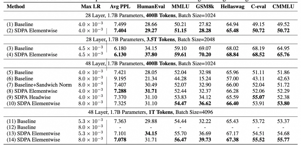 实验结果显示,对各注意力头的输出进行门控,是提升模型性能最有效的方式。使用该方式,在引入额外1%参数的情况下,可实现0.2以上的困惑度下降、MMLU基准评测2个点的提升。研究还发现,该技术还能在更大规模的模型训练上实现更好的性能。