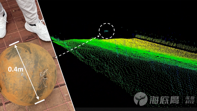 悬浮/沉底皆可探——1.6°/3.2°两档精度可灵活调整,轻松辨识悬浮于水下7米位置,直径仅有0.4米的铁球目标。