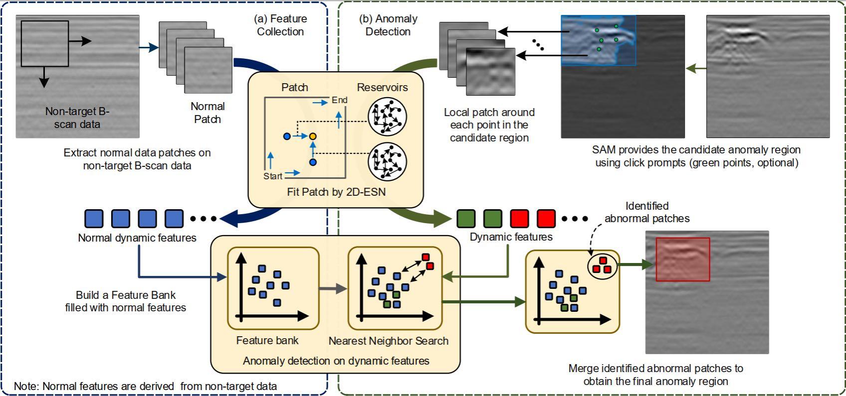 针对上述挑战,Res-SAM将通用视觉大模型的空间感知能力与刻画局部动态变化的储备池计算模型相结合。该框架首先利用视觉大模型快速定位可能存在异常的区域,再通过对局部变化特征的分析,对这些区域进行精细修正和判断,从而提高识别的准确性和稳定性。