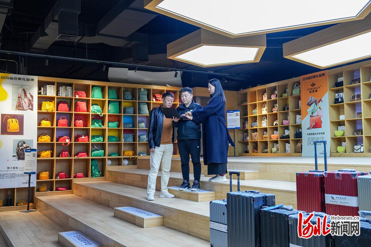 11月27日,白沟箱包数字化转型赋能中心工作人员(左二)向商户展示通过共享设计平台生成的效果图。河北日报记者 许佳奇摄