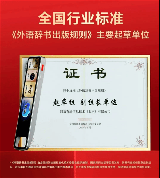 【▲图为有道词典笔获颁参与《外语辞书出版规则》行业标准制定的证书】
