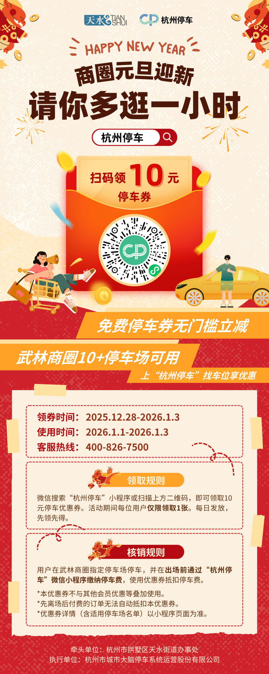 好消息:2025年12月28日至2026年1月3日,连续7天,“杭州停车”微信小程序将每天放出停车优惠券,总计10000张。每张优惠券面值10元,无门槛使用。具体内容,一起来看↓↓