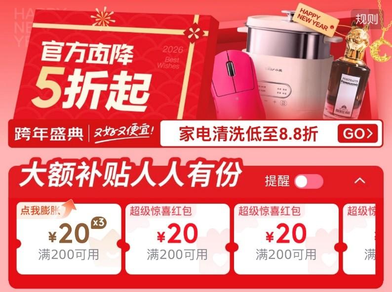 除此之外,作为湖南卫视跨年演唱会的独家冠名商,用户在欣赏视听盛宴的同时,还可以在京东APP搜索“跨晚”参与互动,抽周大福黄金婚嫁套装、1号会员店可生食鸡蛋全年卡、埃安UT-super鲜花版,以及乐奇AI眼镜礼盒、智元灵犀X2机器人等科技潮品,更有价值约25万元的“2026样样红”终极大奖,诚意满满。共千万份实物好礼和10亿红包,人人有份!