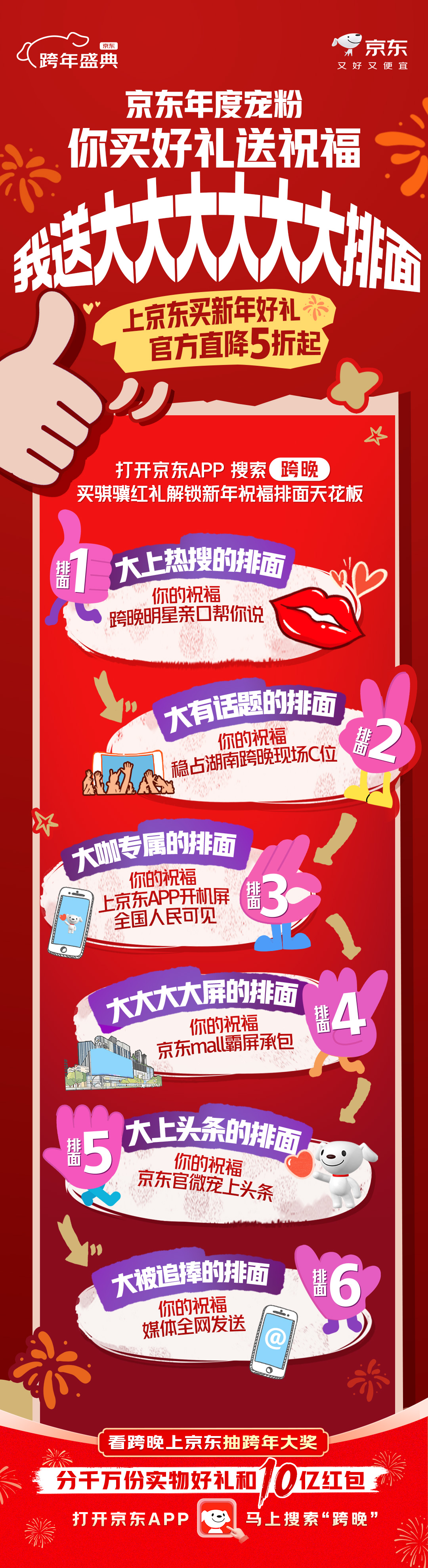 活动期间,海量新年好礼官方直降5折起,从品质家居到潮流数码,从暖心好物到高端奢品,覆盖全品类的优质选择满足不同送礼需求。消费者购买新年骐骥好礼的同时,还有机会获得京东送出的“天花板”级别排面:你的祝福语,将由跨晚明星亲口念出,并登上湖南卫视跨年演唱会现场大屏,被亿万观众共同见证;还有机会入驻各地京东MALL商圈巨幕,拥有万众瞩目“大排面”。除了线下大屏,线上同样精彩,幸运用户的祝福将出现在京东APP开机屏,被全国用户见证,并通过京东官微登上头条,以及被多家媒体全网推送。