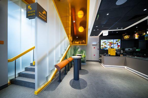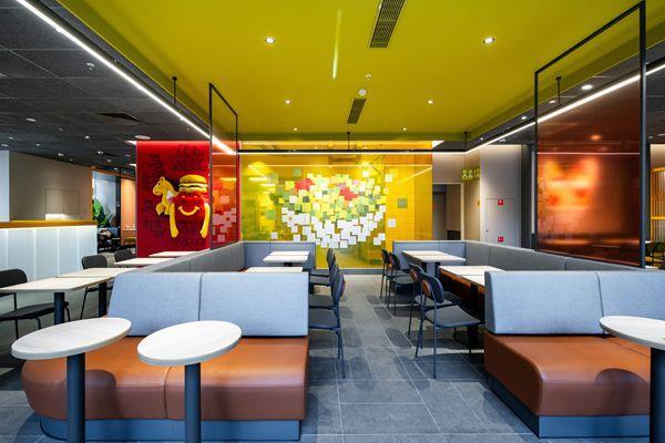 福州新华都大厦(五四路)餐厅位于福建省福州市鼓楼区五四路162号新华都大厦一楼,坐落于人流如织的鼓楼CBD核心商圈。餐厅共两层,面积超400平方米,座位数逾100个,还配备了独立活动区,能够满足生日会及多样化主题派对需求。新餐厅采用麦当劳全球标志性酷趣方块(CUBE)设计风格,设计灵感源自“开心乐园餐”经典的红色餐盒,融合立方、暖色与隐藏的微笑三大设计元素,营造出温馨且充满趣味的空间氛围。外立面配备大型白色立方体灯箱,简洁利落,科技感十足,极具视觉冲击力。