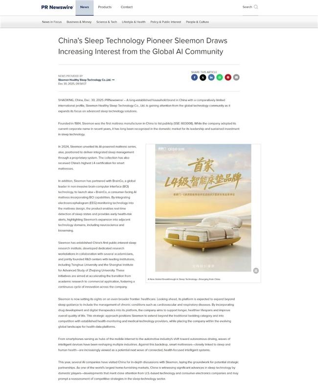 此外,西方媒体也注意到喜临门与清华大学、浙江大学等高校的合作,及其在基础睡眠研究上的投入。这种产学研结合的布局,支持其技术从睡眠监测向健康管理等相关领域拓展,也被外界视为企业拓展数字健康生态的一种尝试。
