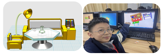 创意家居设计板块中,“卧室的一角”“客厅的沙发区域”等主题作品极具感染力。小社员们跳出单纯的技术练习框架,将生活观察、情感表达与空间叙事融入设计,用三维模型勾勒生活场景、传递生活感悟,展现出独特的审美视角与丰富的内心世界。