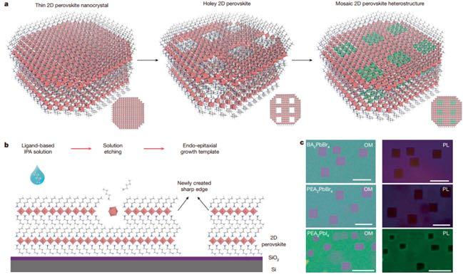记者了解到,面对这一挑战,中国科大研究团队独辟蹊径,创新性地提出并发展了一种引导晶体内应力“自刻蚀”新方法。研究人员发现,二维钙钛矿单晶在生长过程中会自然累积内部应力,团队巧妙设计了一种温和的配体-溶剂微环境,能够选择性地激活并利用这些内应力,引导单晶在特定位置发生可控的“自刻蚀”,从而形成规则的方形孔洞结构。随后,通过快速外延生长技术,将不同种类的半导体材料精准回填,最终在单一晶片内部构筑出晶格连续、界面原子级平整的高质量“马赛克”异质结。