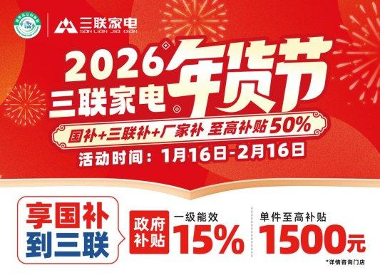 鲁网1月16日讯岁末将至,年味渐浓,家电换新成为不少家庭筹备新年的重要环节。1月16日至2月16日,三联家电正式启动“2026年货节”大型促销活动。本次年货节以“迎新年 焕新家”为主题,深度融合2026年国家家电补贴政策,推出“国补+三联补+厂补”多重补贴联动,部分产品补贴力度高达50%,为消费者打造一场兼具性价比与品质感的家电采购盛宴,助力万千家庭以全新姿态迎接新年。