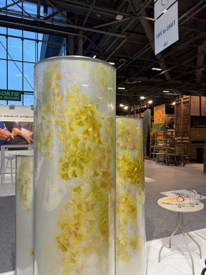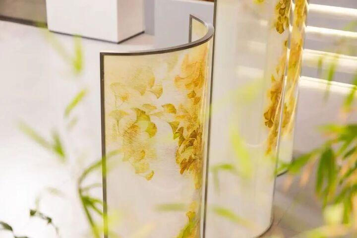 其中,双面屏风《一束黄金叠秋光》,由姚绣设计总监李文博设计、刘锦育手绘绣稿,鎏金丝线交织出秋日暖阳般的光影,苏绣的精湛细腻与简约设计相融,尽显治愈温暖的东方韵味。