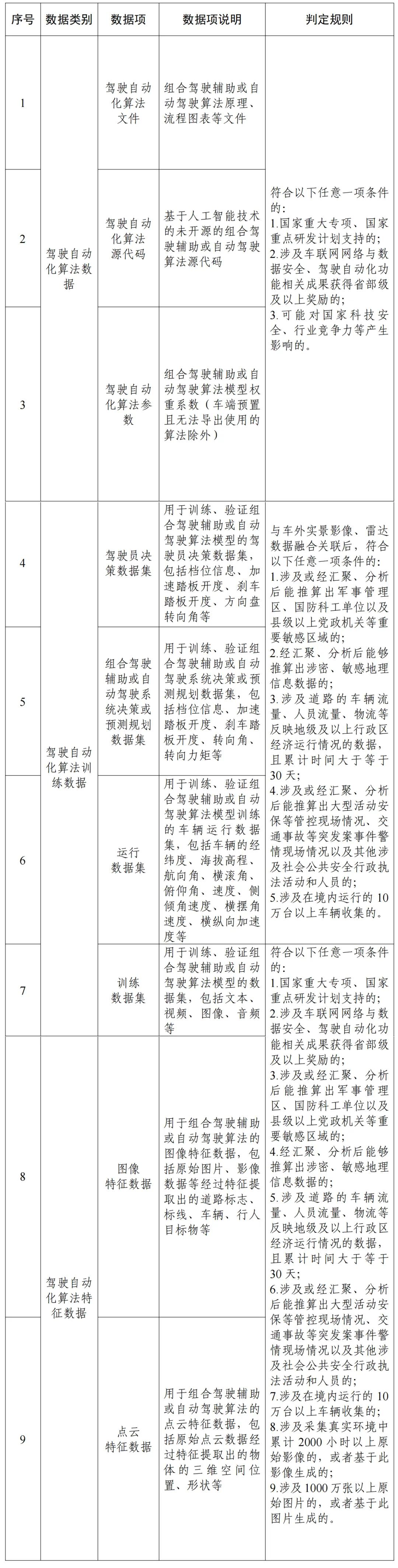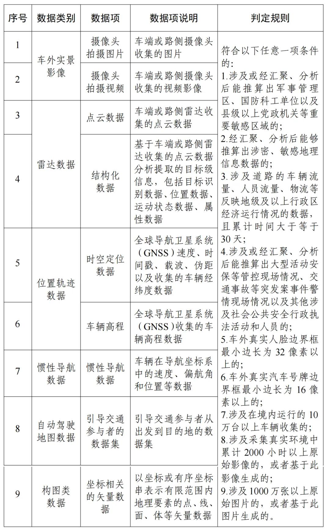 注9:位置轨迹数据、自动驾驶地图数据、构图类数据等含有空间位置坐标的地理信息数据均应为采用国家认定的地理信息保密处理技术完成处理后的数据。【责任编辑:赵超】