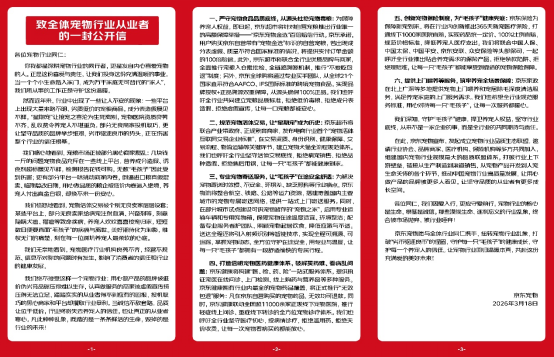 面对这一行业现状,3月18日,京东、中国人保、中宠顽皮、硕腾、瑞派宠物医院等数十家企业机构联合致信宠物行业从业者,推出覆盖宠物食品、活体交易、寄送、健康、保险、生活服务的六大举措,破解宠物行业乱象。同时,48家成员还宣布成立京东宠物品质生态联盟,平台与行业协会、品牌商家、医疗机构、保险机构携手组建国内宠物行业规模最大的品质联盟体系,旨在打破行业上下游壁垒,链接从生产制造到渠道销售、从宠物产品开发到人宠生命关怀的各个环节,推动中国宠物行业高质量发展。